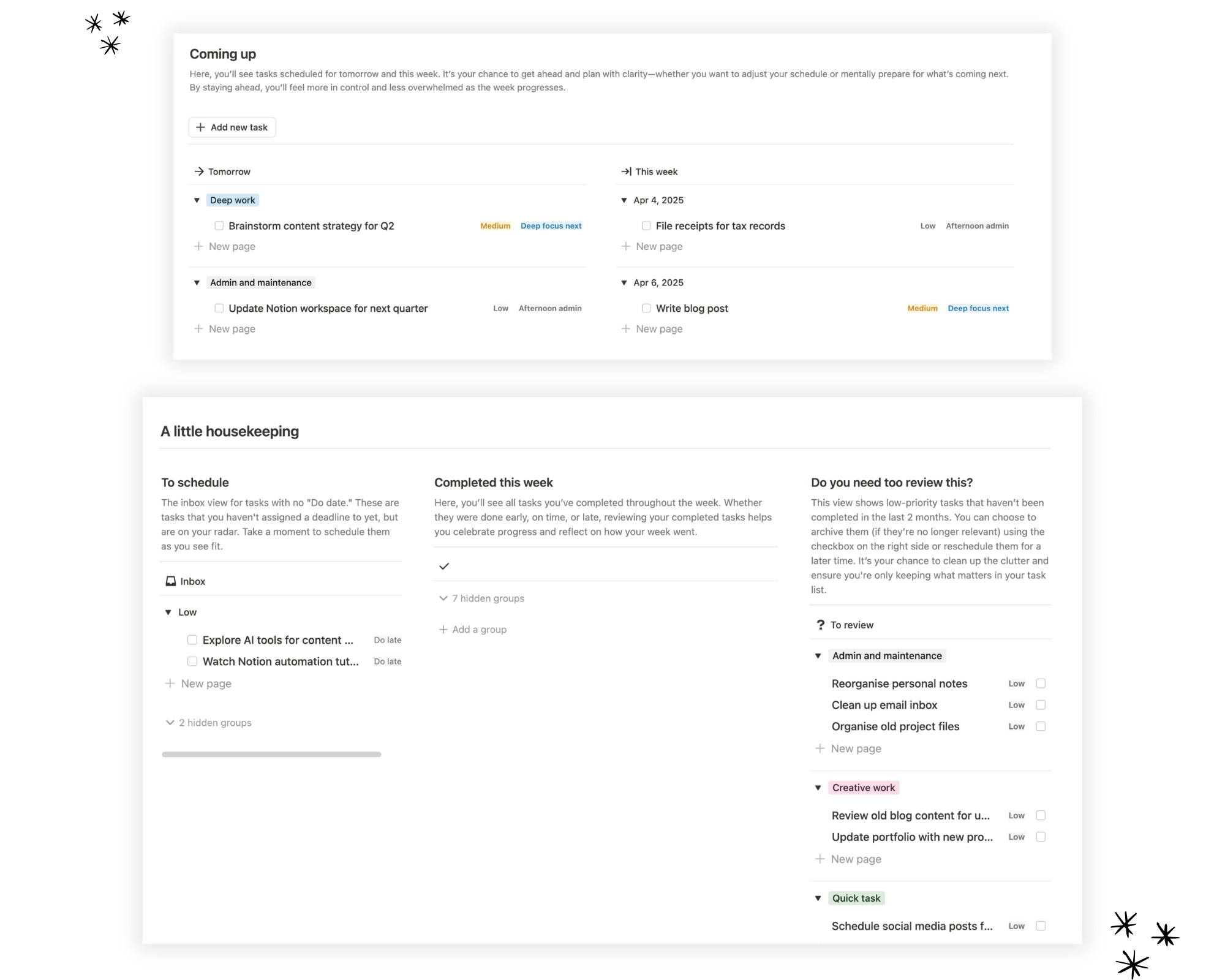 Energy-aligned planning: Tag tasks as high focus, low energy, or neutral to make scheduling easier.